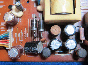 電解コンデンサのてっぺんが膨らんでいます。これを交換して直れば万々歳です。 |