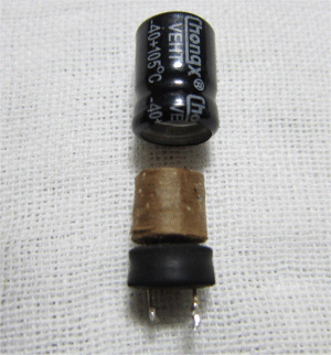 すると驚くことに、前回交換した新品の電解コンデンサのアルミケースが外れていたのです。